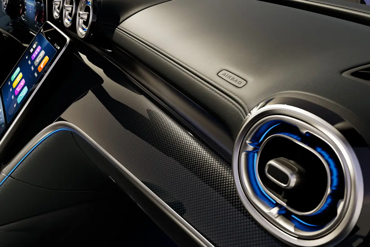 - AMG Line: передній обвіс AMG з повітрозабірниками та хромованим декоративним елементом, А-подібне облицювання радіатора зі світловим малюнком Mercedes-Benz з інтегрованою зіркою Mercedes-Benz, спортивна підвіска зі спортивним кермовим керуванням, 19-дюймові диски AMG багатоспицевого дизайну, спортивні сидіння з вбудованим підголівником, обшивка стелі салону з тканини чорного кольору.