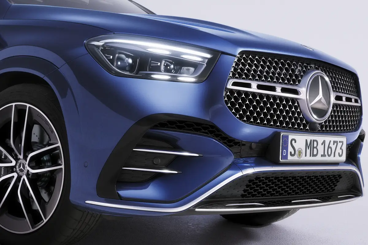 Оновлена передня частина GLE купе виглядає ще спортивніше завдяки діамантовій решітці радіатора з візерунком Mercedes-Benz. У серійній версії AMG Line передній бампер отримав хромовану окантовку й повітрозабірники нової форми. Разом ці акценти підкреслюють динаміку і додають виразної присутності на дорозі.