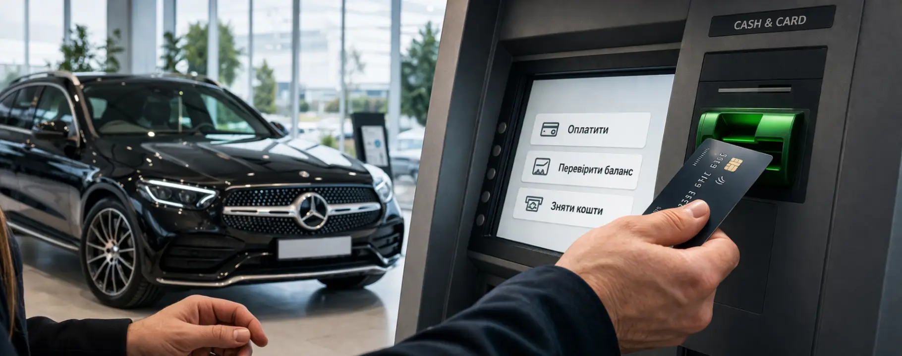 Повну вартість авто (у тому числі перший внесок за кредитом чи лізингом) Ви сплачуєте у відділенні банку – готівкою або безготівково за реквізитами через застосунок банку.